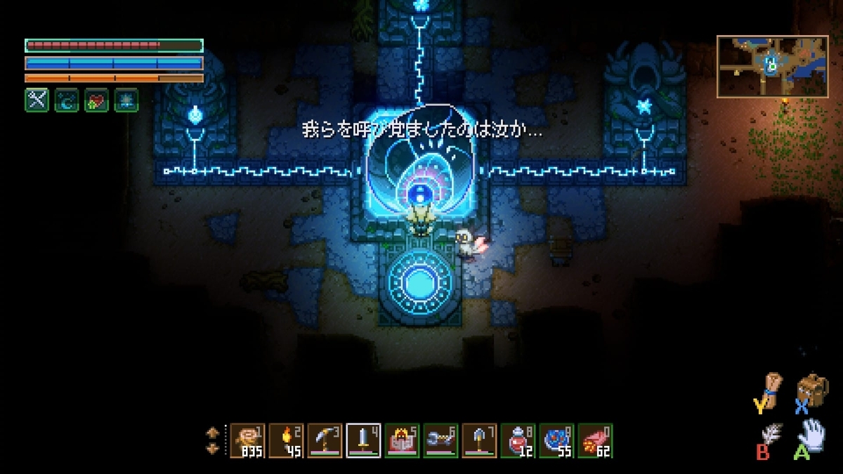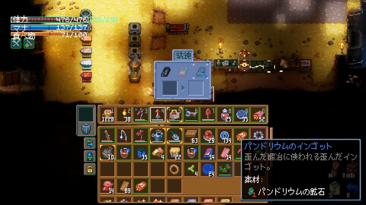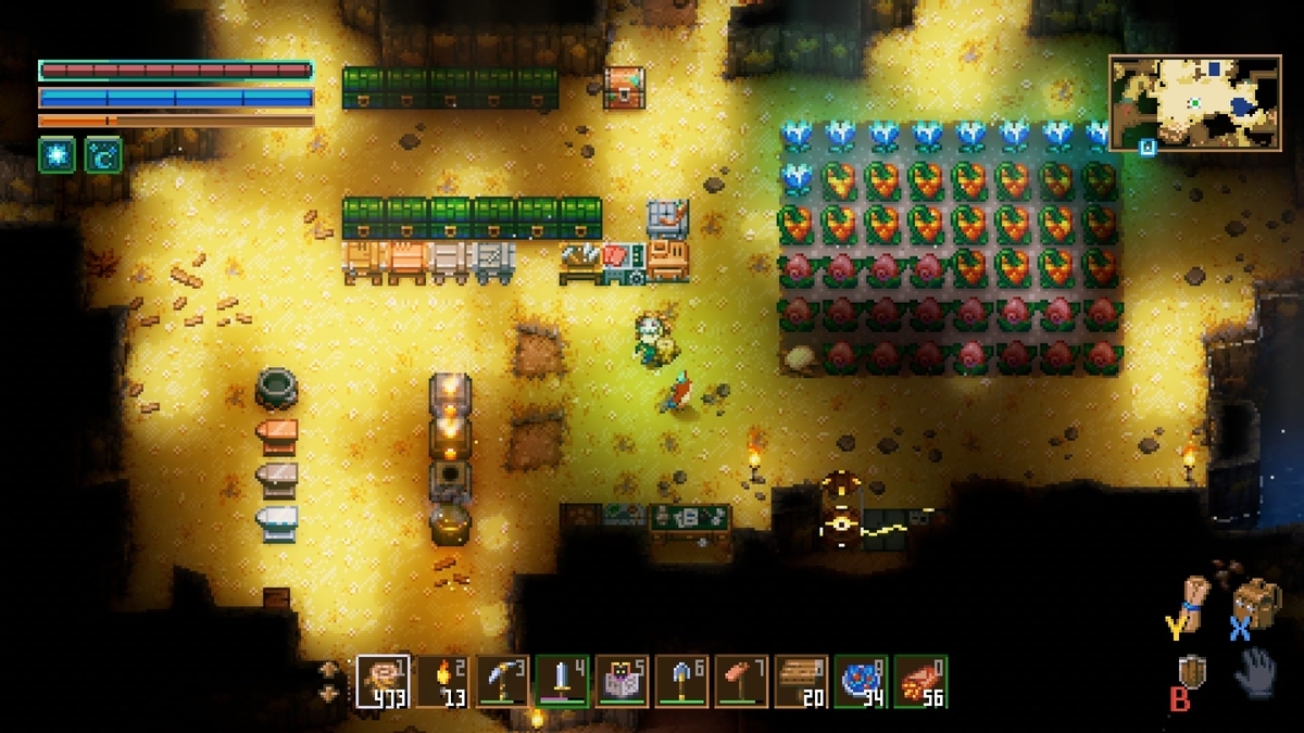 壁を掘って素材を集め、拠点を拡張して武器や工具を作り、探索範囲を広げたりバイオームのボス討伐を目指すのが基本的な流れとなります。